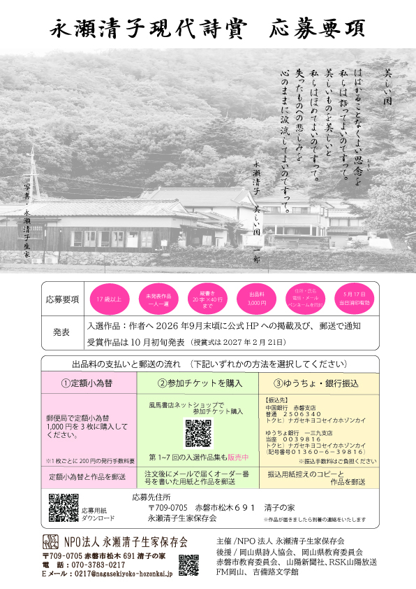 応募先:NPO法人 永瀬清子生家保存会(〒709-0821 岡山県赤磐市松木187)