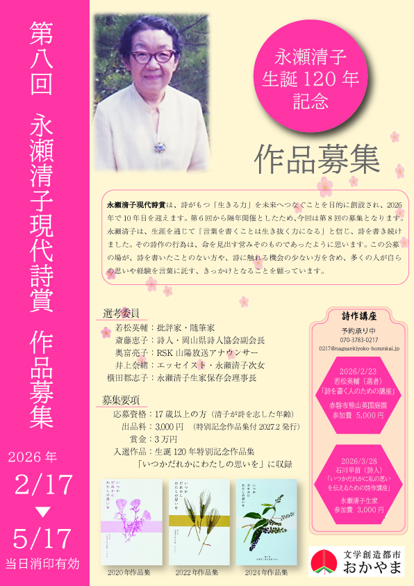 表彰式:2027年2月21日(日) 会場:永瀬清子生家「清子の家」(岡山県赤磐市松木691)